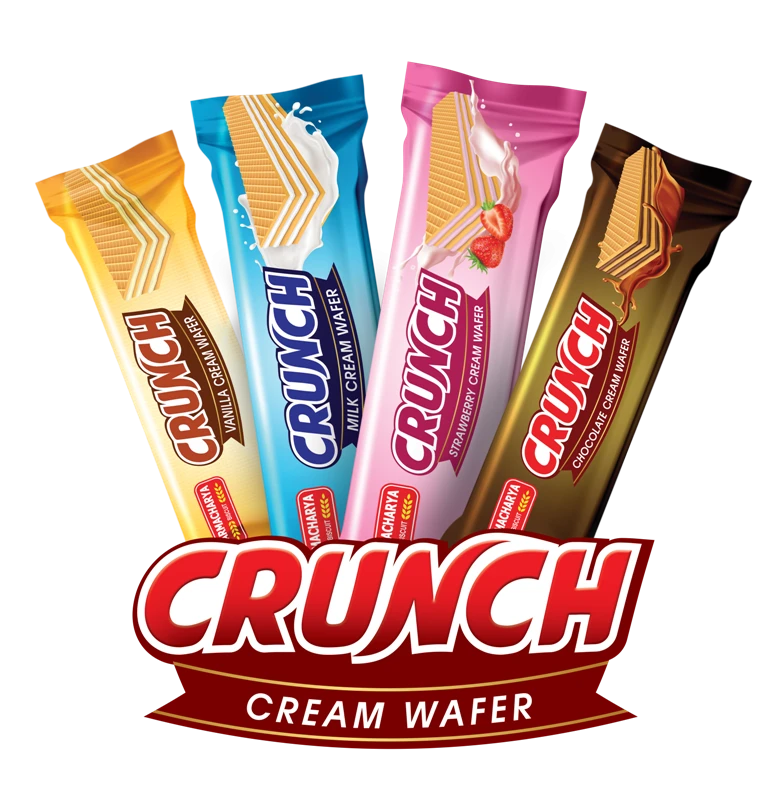 Karmacharya Crunch Cream Wafers are a popular Nepali snack known for their crispy wafer texture and creamy filling. They come in four flavors: Strawberry, Milk, Chocolate, and Vanilla. These wafers are a light and tasty treat, perfect for enjoying on their own or with a drink.